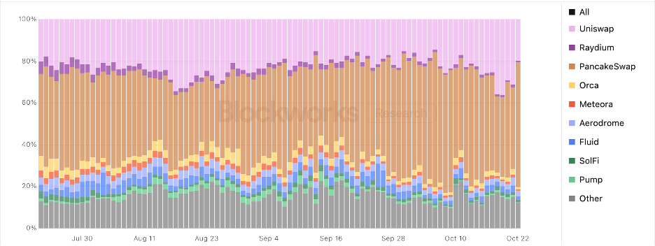 Figure 2: According to Blockworks Research, BNB Chain’s DEX spot market share is the largest of any single DEX in the DeFi space