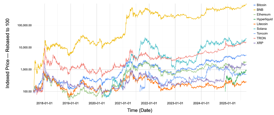 Figure 11: Across multiple market cycles, BNB stands out as the top-performing web3 assets compared with others, based on structure (from 2017-07-25 to 2025-10-07, rebased to 100)