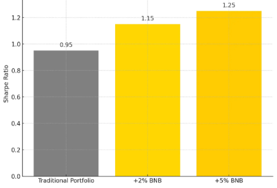 BNB is not tailored only to crypto natives, but it is designed to be easy to understand and use for new comers with no prior crypto experiences. Introducing BNB may significantly improve risk-adjusted results; for example, in simulated models, adding 2%–5% BNB to a standard equity-bond-commodity mix increased the Sharpe ratio from 0.95 to as high as 1.25. This demonstrates BNB’s effectiveness as an alternative asset allocation—enhancing diversification and capturing Web3 participation and potentially benefits as well. Current market conditions may present asset managers with a structural opportunity to integrate BNB as an alternative asset.