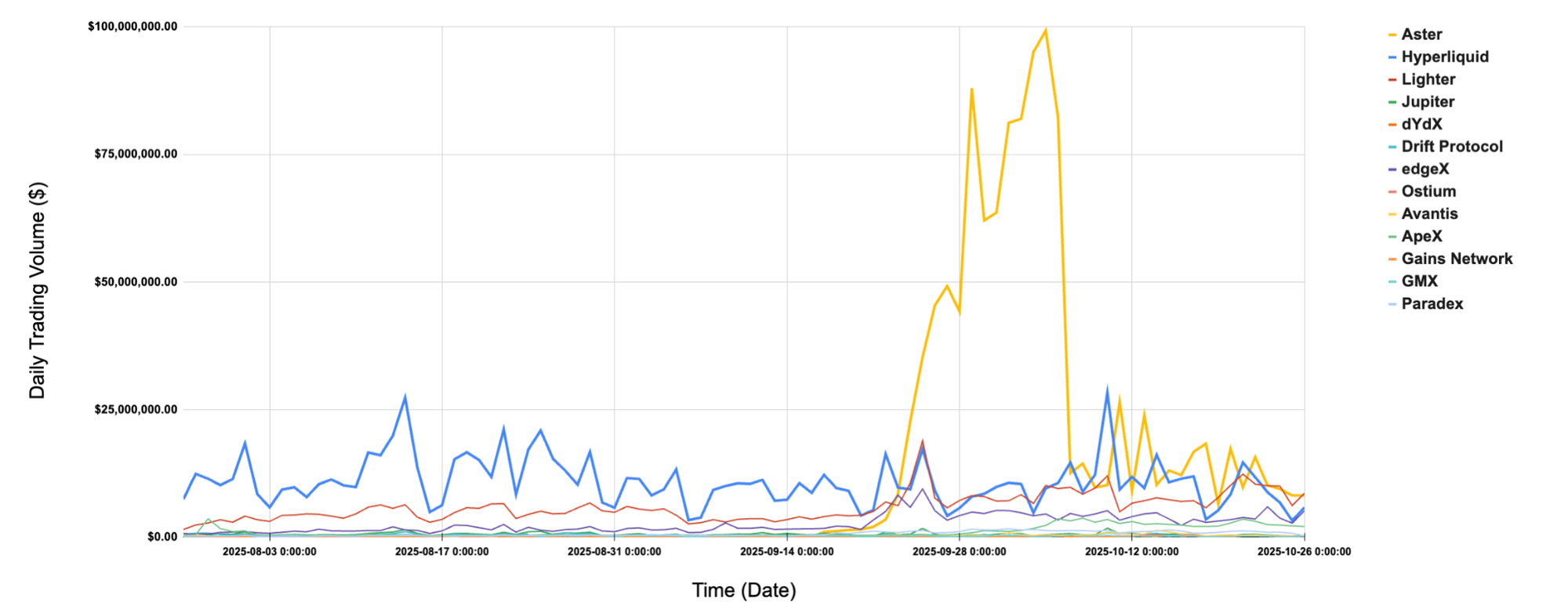 Figure 3: Aster ignites BNB Chain’s breakout with its on-chain perpetuals presenting a significant lead over Hyperliquid