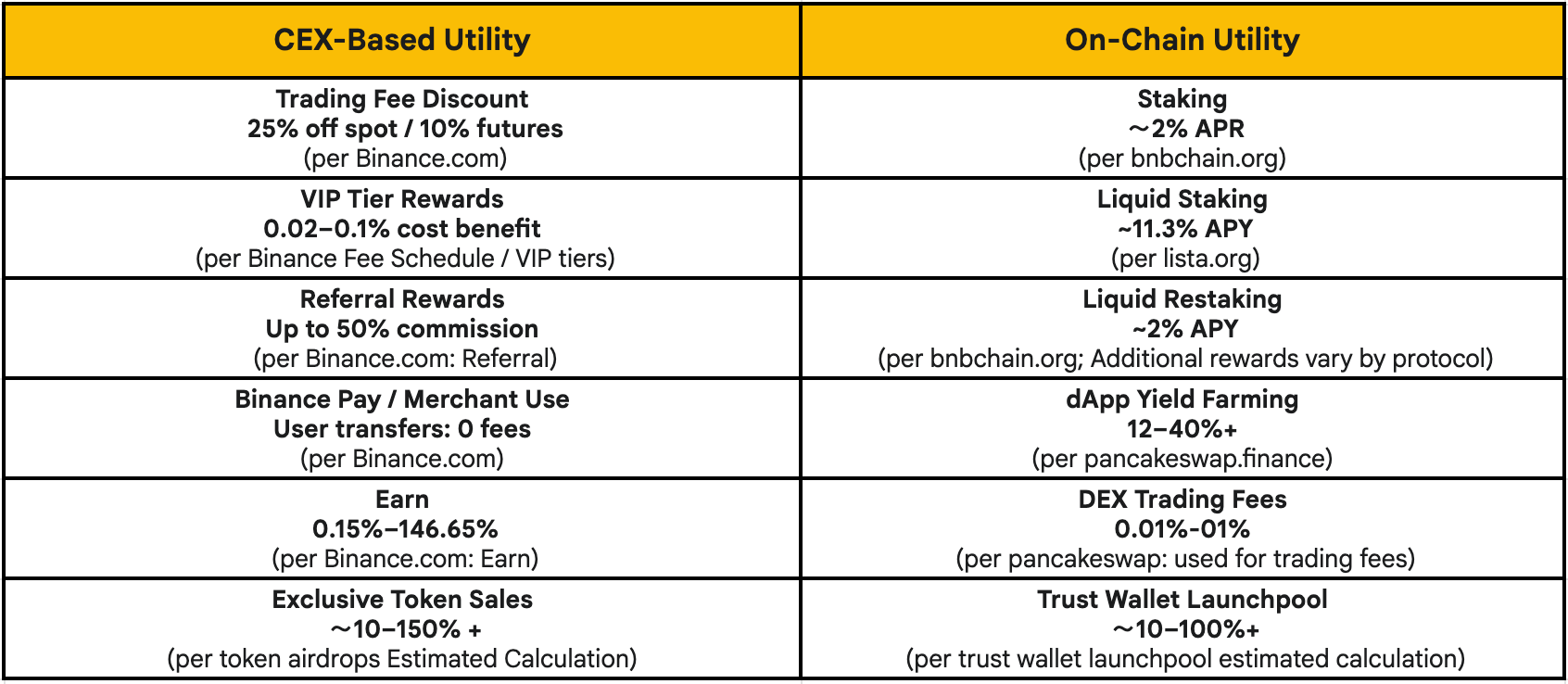 Beyond the BNB Chain itself, BNB is also adopted by other platforms that integrate it as a utility token. For example, on Binance’s centralized exchange (CEX), users holding BNB enjoy trading fee discounts and access to token launch programs like Launchpool and Megadrop, among other programs. These off-chain use cases, alongside on-chain uses, reflect BNB’s growing role as a multi-context Web3 token spanning both decentralized and centralized ecosystems.