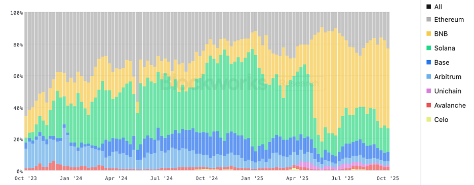 As a promising example, in mid-2025, Binance launched Binance Alpha, a liquidity incentive and builder program that triggered a sharp increase in on-chain DEX activity. As shown in the chart, BNB Chain’s DEX volume briefly exceeded ~70% of the total on-chain spot volume, demonstrating the ecosystem’s depth of latent user and developer engagement.