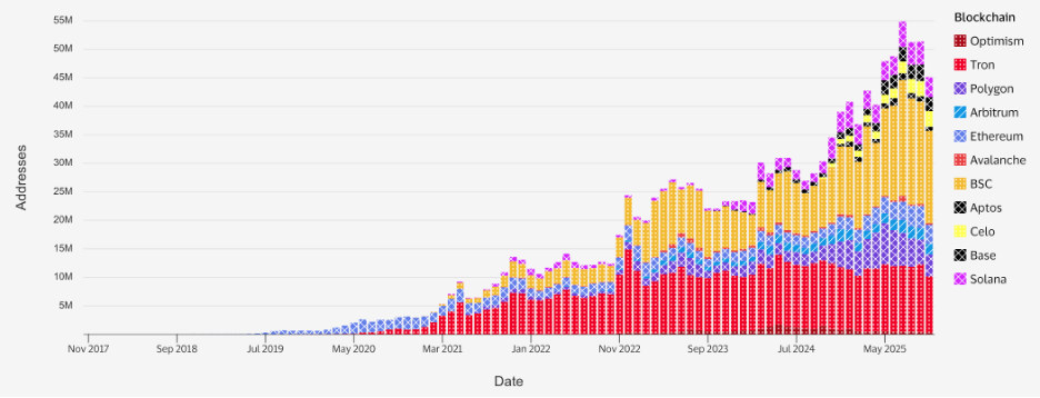 Figure 10: BNB Chain (BSC) leads in stablecoin wallet activity with the fastest growth over the past 5 years—underscoring a significantly wide on-chain adoption